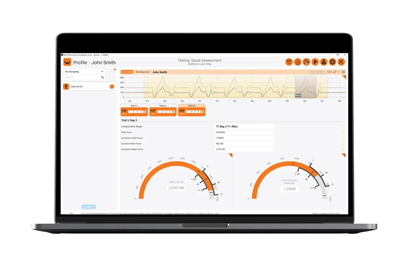 - Automatic detection and analysis of over 15 force plate tests, including squat assessment.
