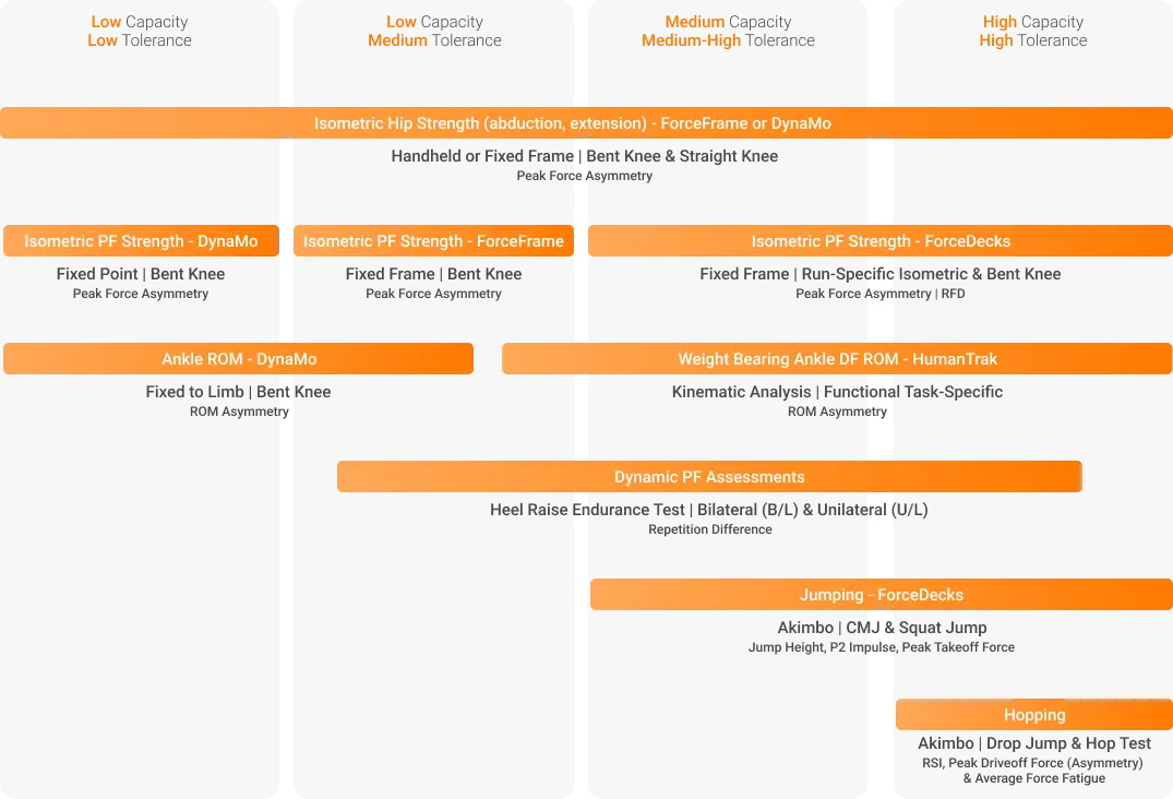 | Hopping | Performance deficits of 16% to 35% in individuals with Achilles tendinopathy. (9) Average and maximal hop height deficits of 18% & 16% respectively. Reduced hopping quotient of 20% of symptomatic side. (9) | ForceDecks Single Leg Hop Test | Average RSI Average Peak Drive Off Force Asymmetry Average Force Fatigue | Return-to-sport. Introduce higher-intensity running or jumping (e.g., pace, etc.). |