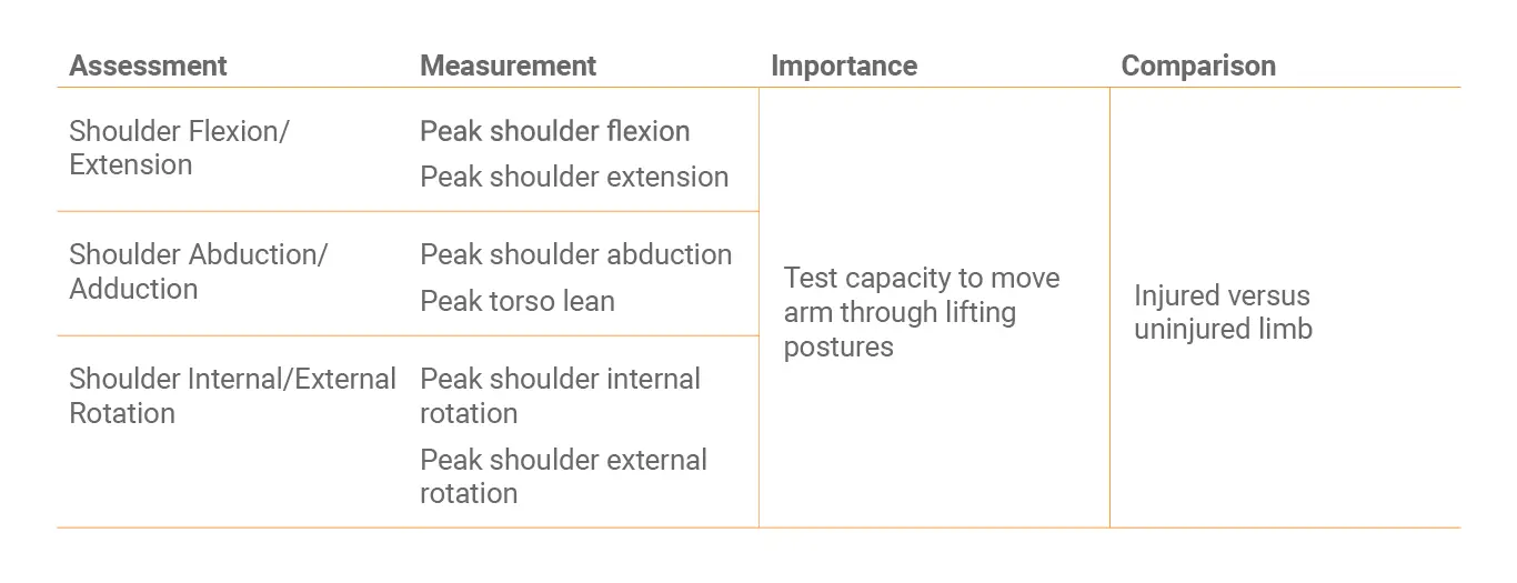 Bruce attended his local physiotherapist for an initial consultation. The physiotherapist reviewed Bruce’s medical certificate and proceeded with initial subjective and objective assessments. The physiotherapist determined the mechanism of injury as acute episode induced by lifting equipment overhead at work, reviewed the history of pain, and confirmed Bruce’s rehabilitation goals. Bruce’s physiotherapist recorded Bruce’s perceived level of pain when performing shoulder abduction, flexion, and external rotation, and when palpating the top of the shoulder. The limited shoulder range of motion and tenderness of the shoulder area confirmed the shoulder bursitis diagnosis from the GP. To capture baseline range of motion and determine the magnitude of asymmetry between arms, Bruce completed shoulder flexion/extension, abduction/ adduction, and internal/external rotation HumanTrak assessments. Bruce presented initially with frozen shoulder that prevented pain-free movement of the shoulder to an abducted position. Therefore, shoulder internal/external rotation was performed with no shoulder abduction.