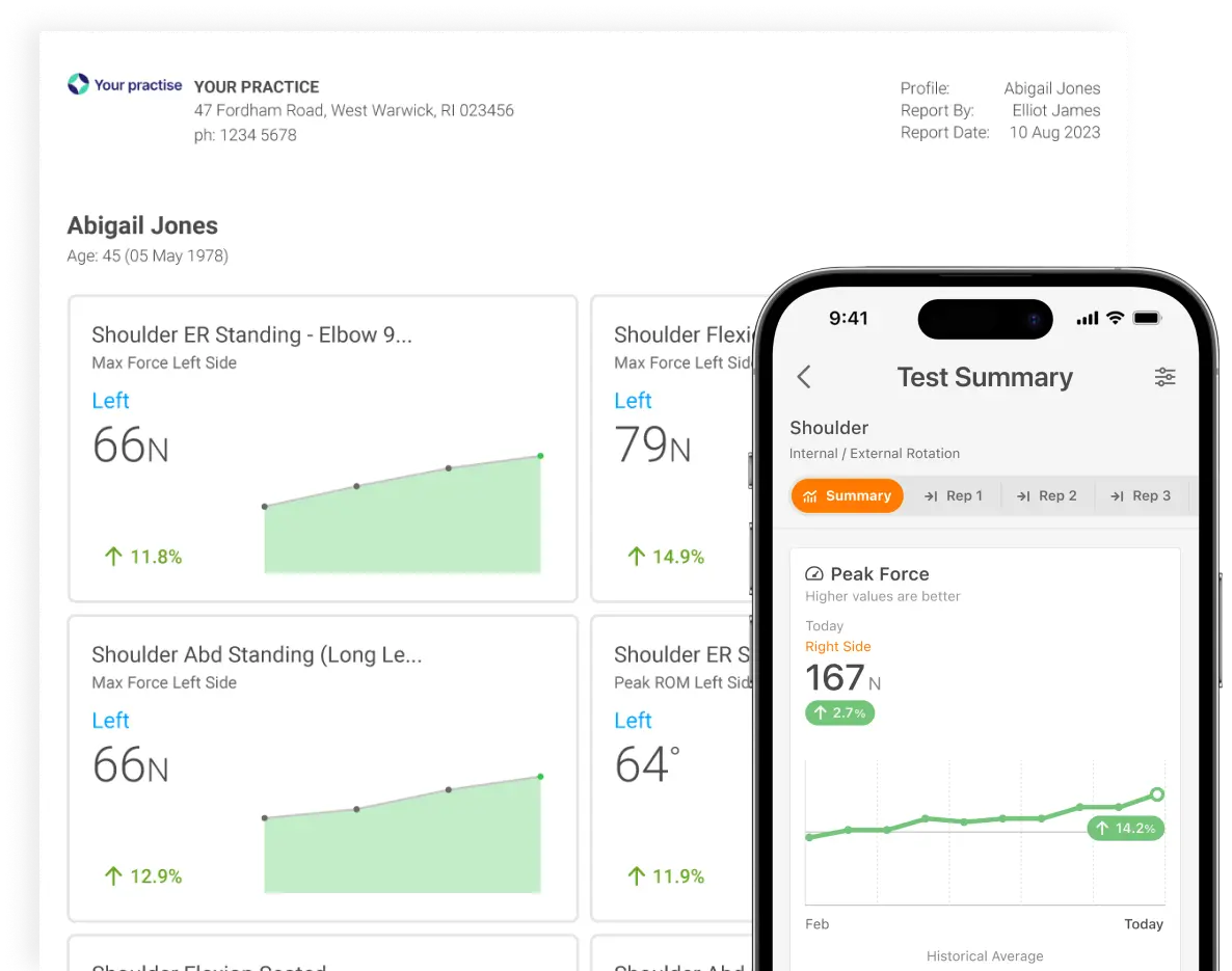 Real-time strength and movement visualizations make the DynaMo app extremely engaging, gamifying the assessment process and making it easy for both you and your patient to understand how they’re performing and how they’re progressing over time.